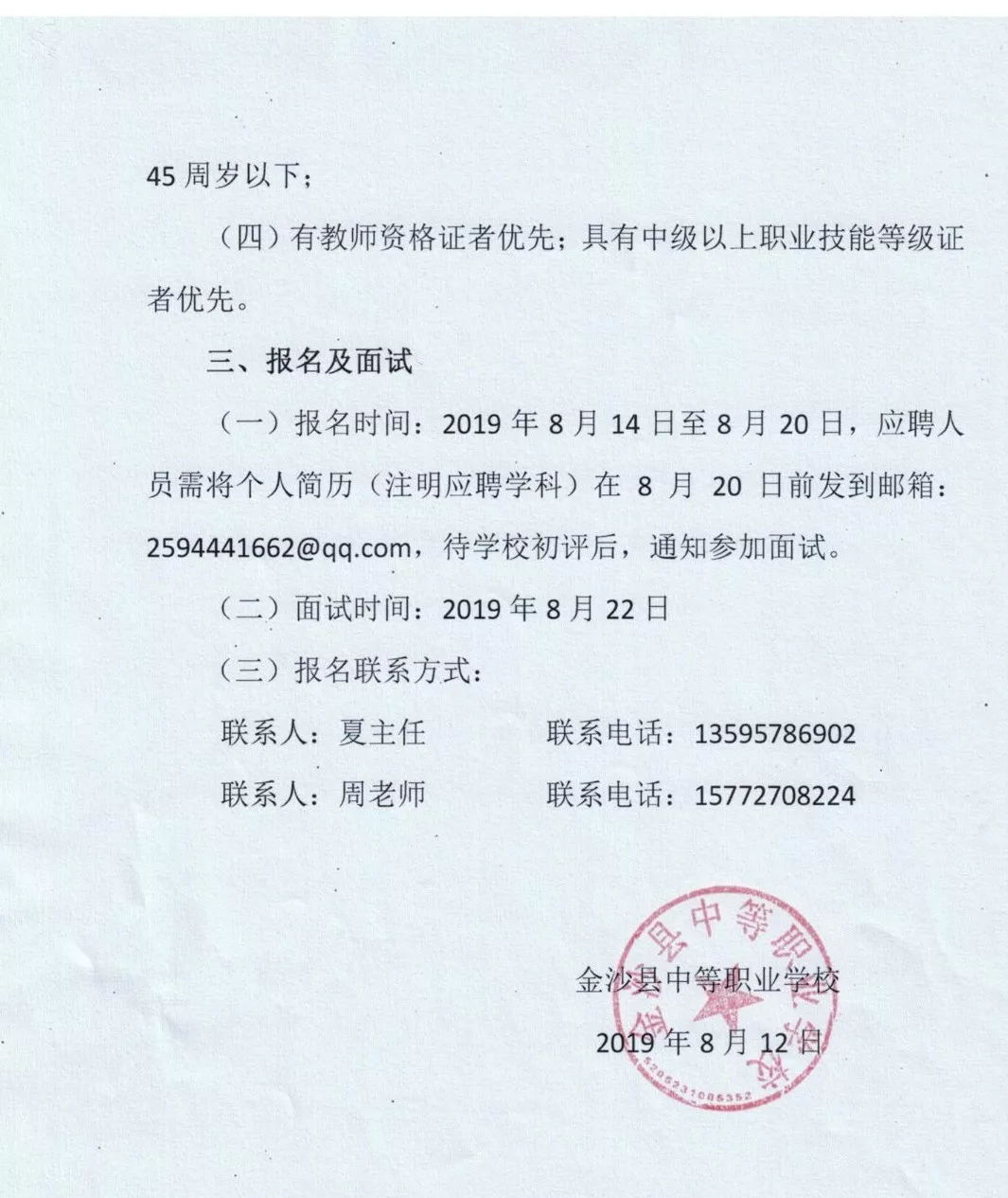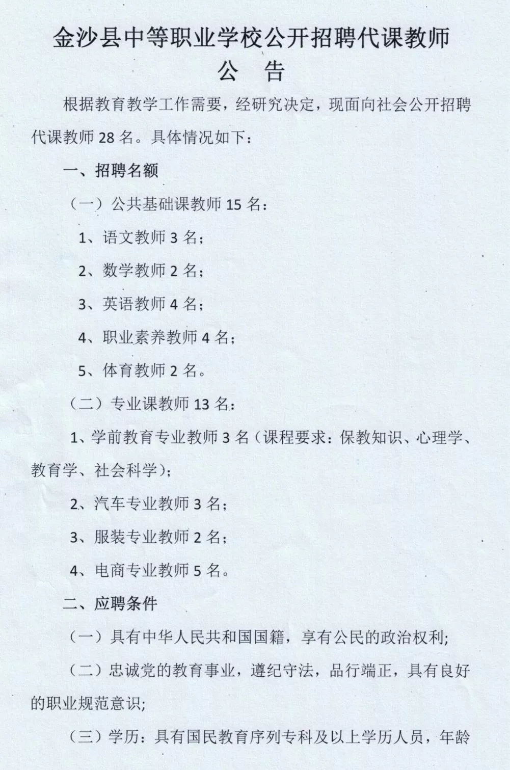 2019年金沙縣中等職業(yè)學校招聘28名代課教師公告(報名截止8月20日)