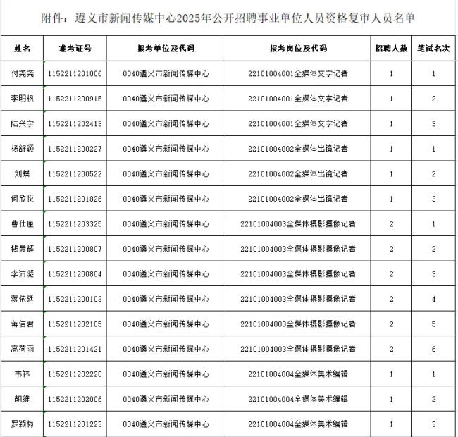 附件:遵義市新聞傳媒中心2025年公開(kāi)招聘事業(yè)單位人員資格復(fù)審人員名單